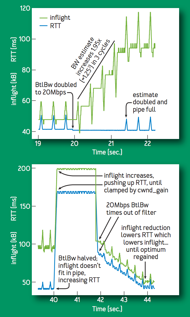 次の図は,BtlBw が 10 [Mbps], 40 [ms] のフローに対して, 20 秒後に BtlBw を 20 [Mbps] に急増させた場合と,その更に20秒後に 10 [Mbps] に急減させた場合の inflight, RTT の遷移である. BtlBw が増加すると,delivery rate が増加し,新たな windowed-max-filter の出力が増加し,pacing rate が増加する.したがって,pacing rate の倍数増加で新たな bottleneck rate へ収束する.逆に BtlBw が低下すると,バッファ長の増加によって inflight, RTT が増加する.20 [Mbps] の windowed-max-filter が時間経過によって失われると,delivery rate が低下する.その後は,RTT が低下しなくなるまで inflight を低下させるように pacing gain を変化させ制御する.