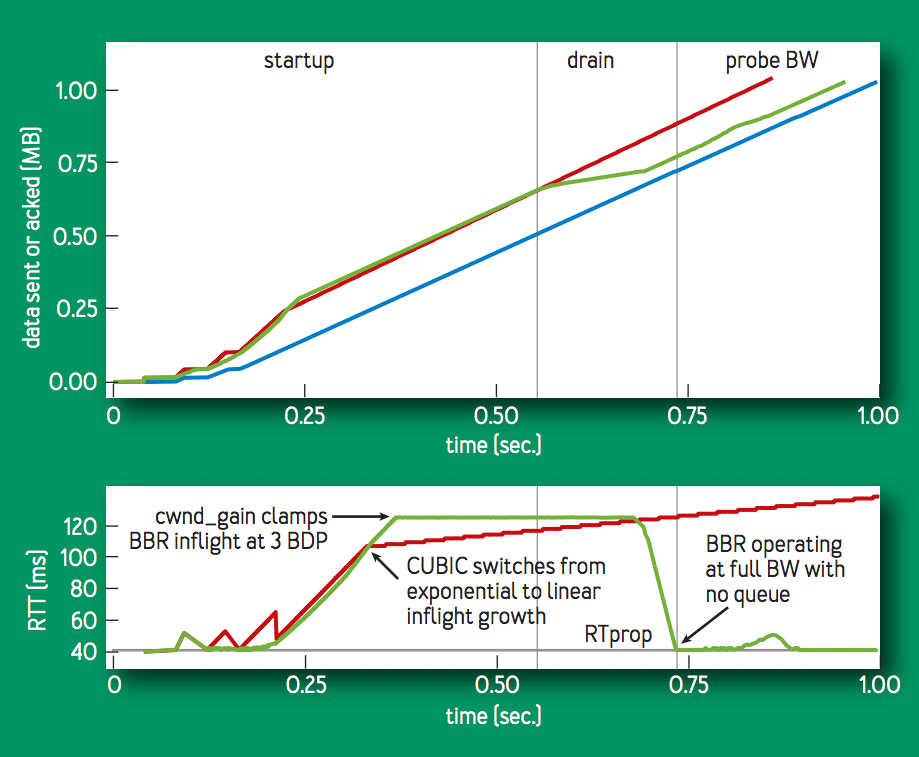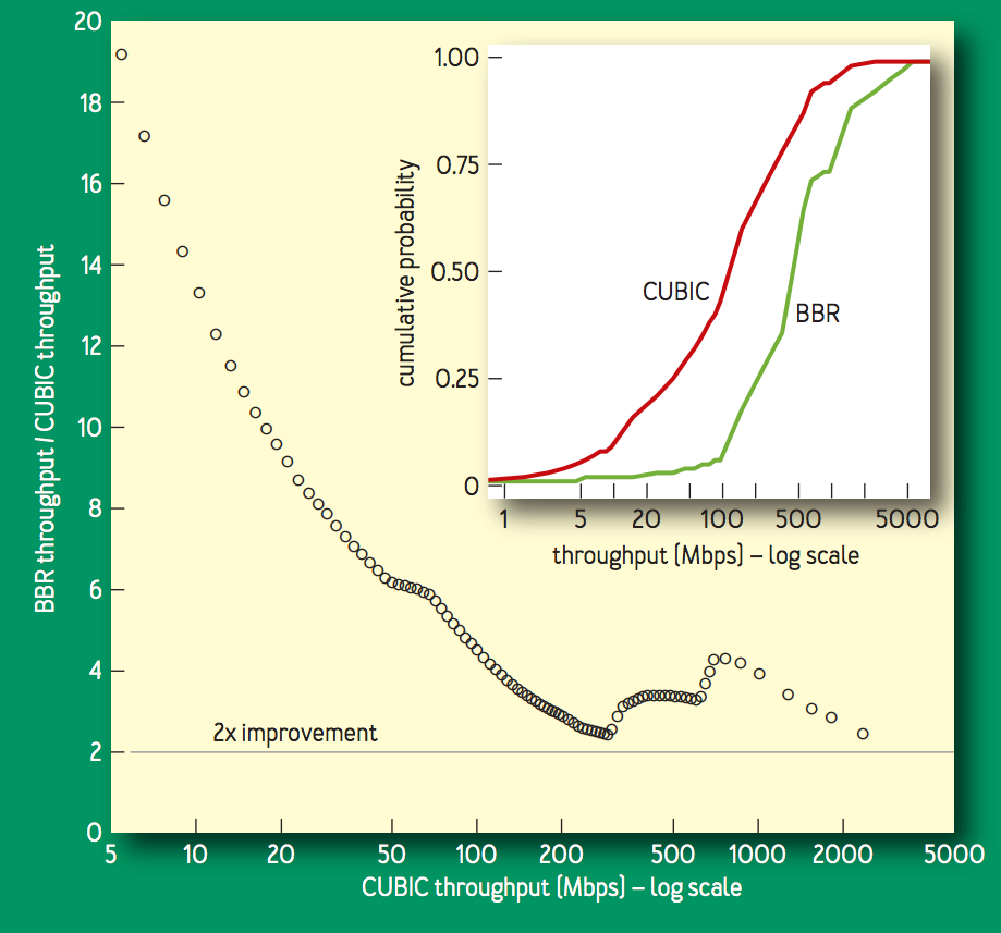 Neal Cardwell, Yuchung Cheng, C. Stephen Gunn, Soheil Hassas Yeganeh, Van Jacobson, “BBR: Congestion Based Congestion Control,” Communications of the ACM, Vol. 60 No. 2, Pages 58-66, http://queue.acm.org/detail.cfm?id=3022184 ↩